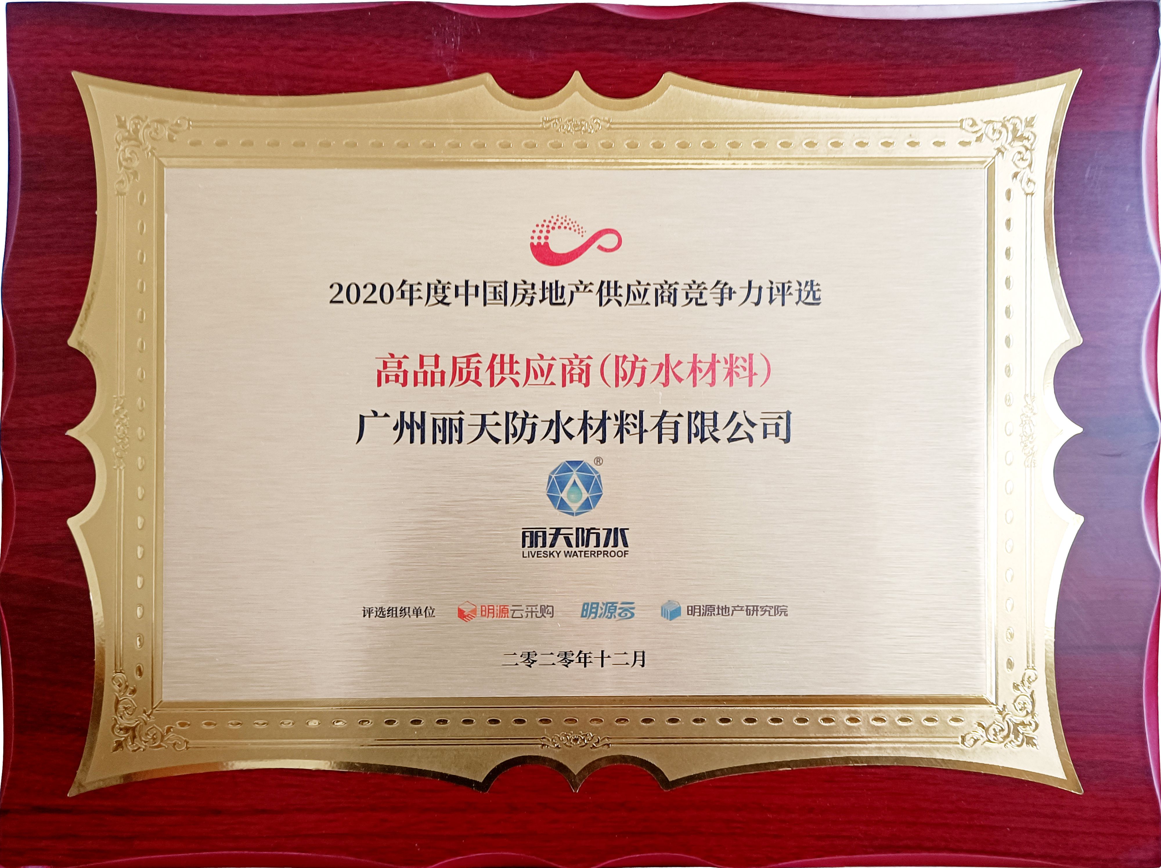喜報(bào)│麗天防水(shuǐ)榮獲2020中國(guó)房地産防水(shuǐ)材料“高(gāo)品質供應商”!
