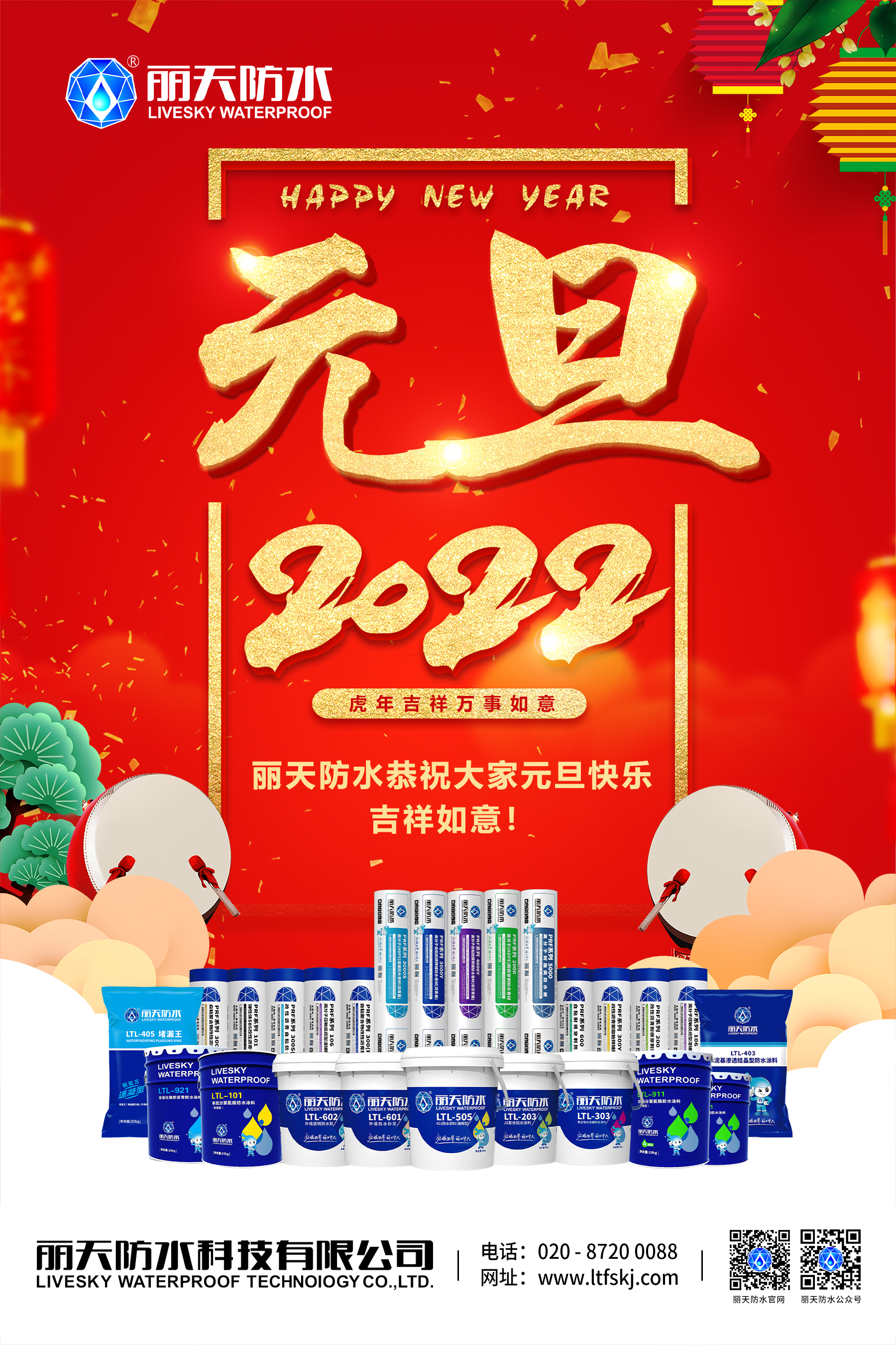 麗天防水(shuǐ)衷心祝願關心和支持麗天的朋友(yǒu)們在新的一(yī)年(nián)裡(lǐ)生(shēng)意興隆、财源廣進、身體健康、阖家幸福!