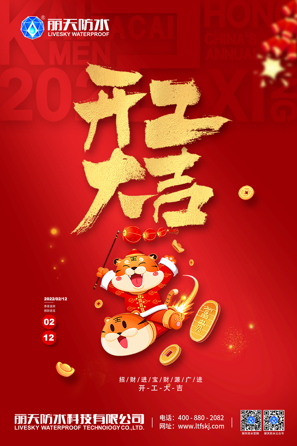 新的一(yī)年(nián),新的征程,麗天防水(shuǐ)祝大家虎年(nián)生(shēng)意興隆,财源廣進!